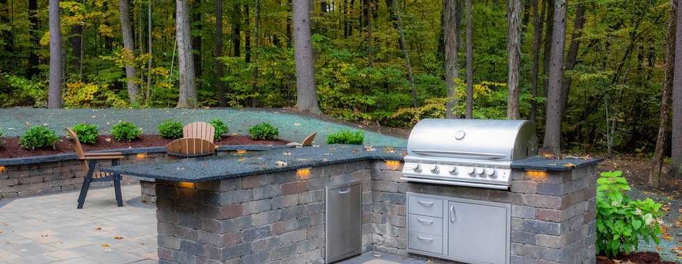 Material selection was critical here. We blended brushed stone in warm browns with cooler greys to create depth and balance. These tones work with the surrounding landscape instead of fighting it, allowing the space to feel elegant without feeling stark. The result is a palette that feels modern but still rooted in the natural environment of Hollis, NH.